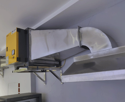 2.高效过滤消声段:前端处理后,大部分油烟被去除,逃逸的微米级油烟经后端高效过滤段(粗滤和精滤)处理后,大部分被过滤,剩余的亚微米级油雾颗粒、有毒有害物质和烟气中的异味经低温等离子体净化段进入处理。